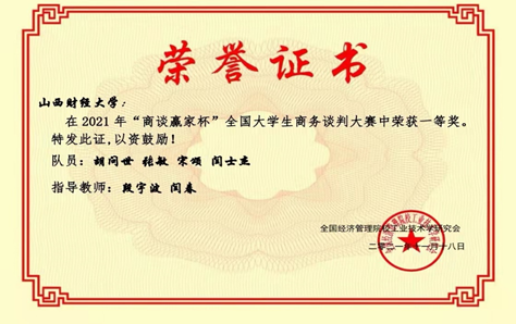 在2021年“商谈赢家杯”全国大学生商务谈判大赛(中文赛道)中摘得全国大学生商务谈判大赛团队一等奖。这是继我校在10月31日“商谈赢家杯”全国大学生商务谈判大赛(英文赛道)中获得佳绩之后,我校参与该项赛事取得又一优异成绩。我校获奖队伍“春天会暗送秋波吗队”由鉴黄师