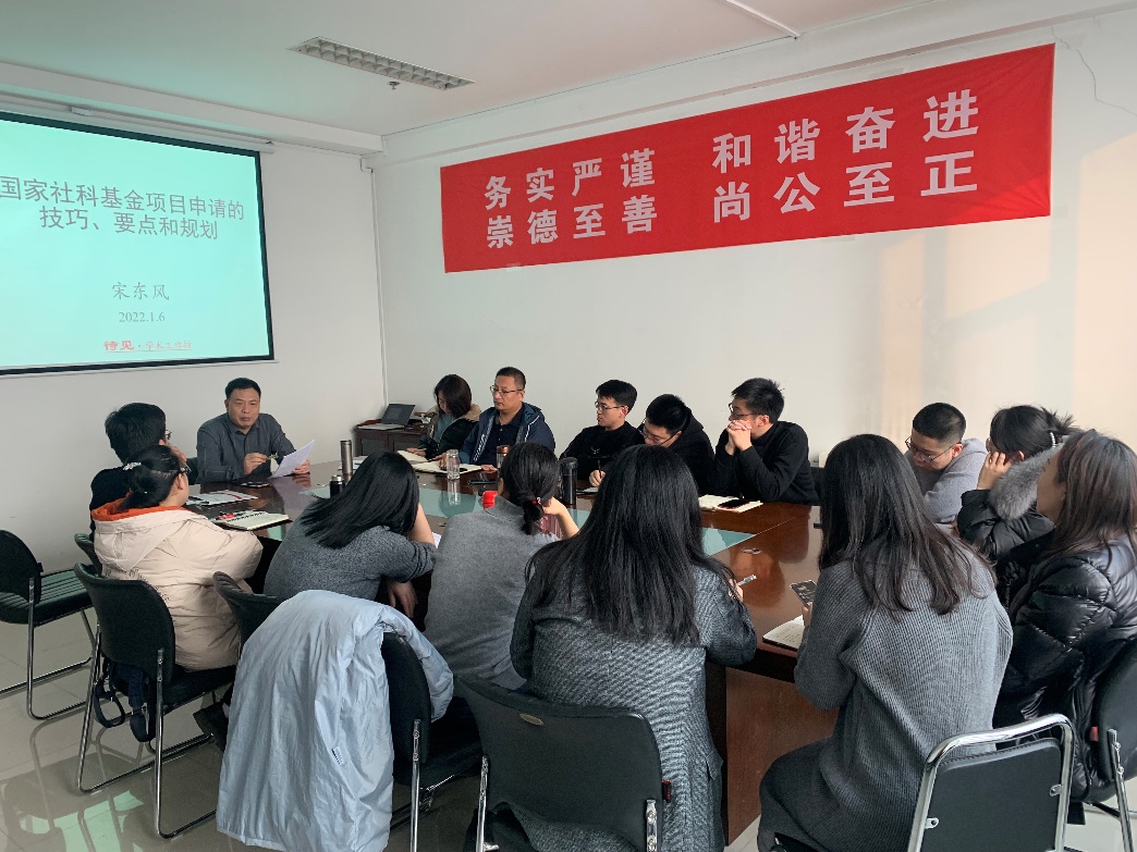 “待见·学术工作坊”举办了第七期学术研讨活动。教育经济与管理教研室主任宋东风博士作了题为“国家社科基金项目申请的技巧、要点和规划”的学术分享,本次活动由行政管理系主任刘海燕博士主持。