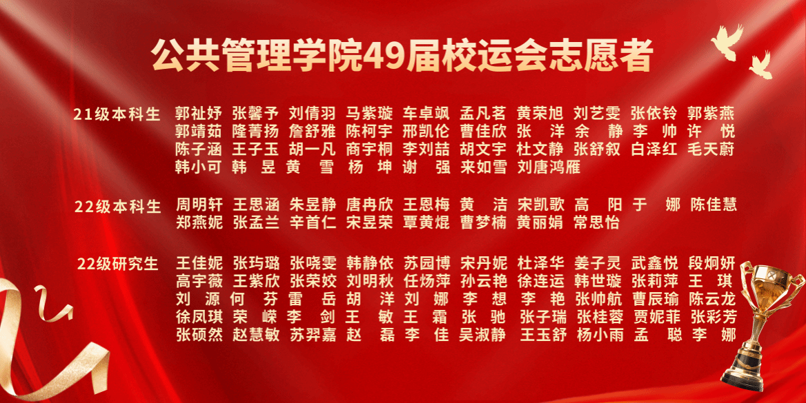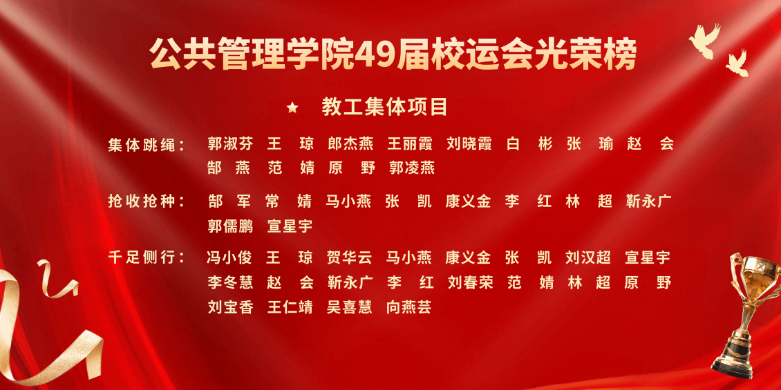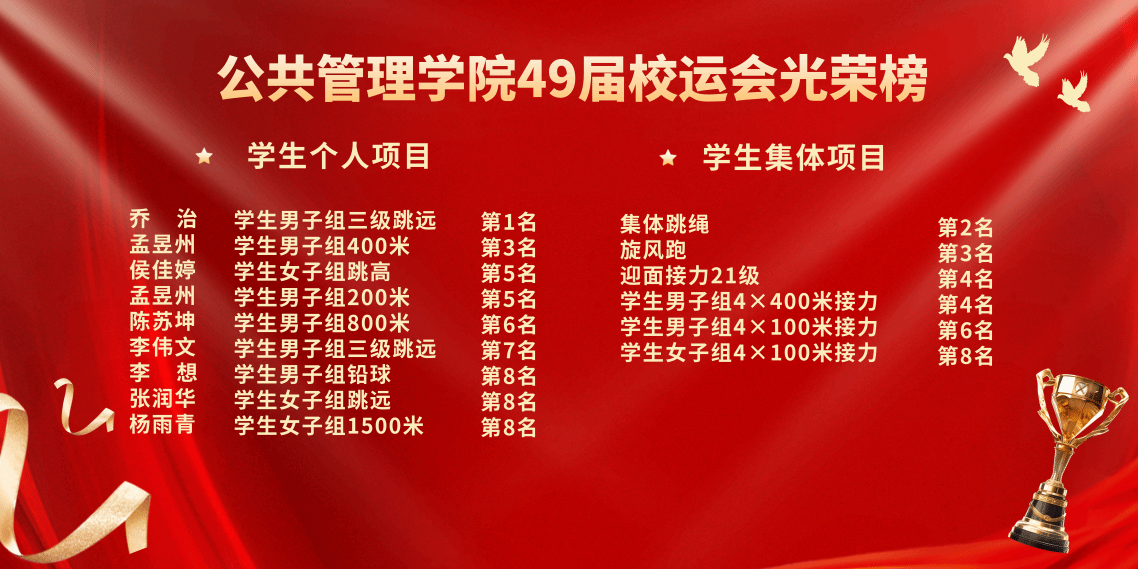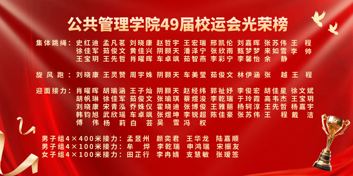 千帆竞发,百舸争流。校运会圆满结束,但闭幕不落幕。顽强拼搏、奋勇争先的体育精神将鼓舞公管人以梦想为帆、以奋斗作桨,全面贯彻新时代党的教育方针,认真落实立德树人根本任务,弘扬践行体育精神,养成良好学习工作习惯和健康生活方式,为学院高质发展蓄势赋能!(编辑制作:22社保研究生张玙璐