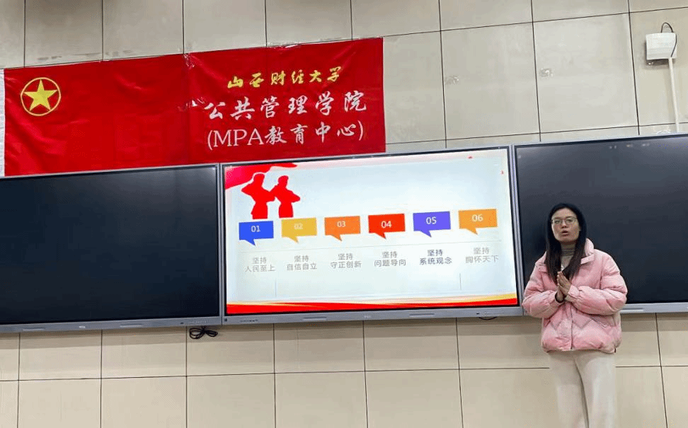 她依次阐述了“六个坚持”的具体内涵,即坚持人民至上、坚持自信自立、坚持守正创新、坚持问题导向、坚持系统观念、坚持胸怀天下,其作为内在统一、相互贯通的有机整体,是对习近平新时代中国特色社会主义思想世界观和方法论的高度凝练,是习近平新时代中国特色社会主义思想“活的灵魂”,具有穿越时空的普遍意义和真理价值。同时,引用《青年成才方法论》中“爱国”“理想”“信念”“品德”等十八个关键词,鼓励学生争做有理想、敢担当、能吃苦、肯奋斗的新时代好青年,筑牢对党忠诚、坚定理想信念、发扬斗争精神、勇于挺膺担当,充分激发新时代山财青年青春激情,为加快奋进“两个基本实现”目标建功立业。