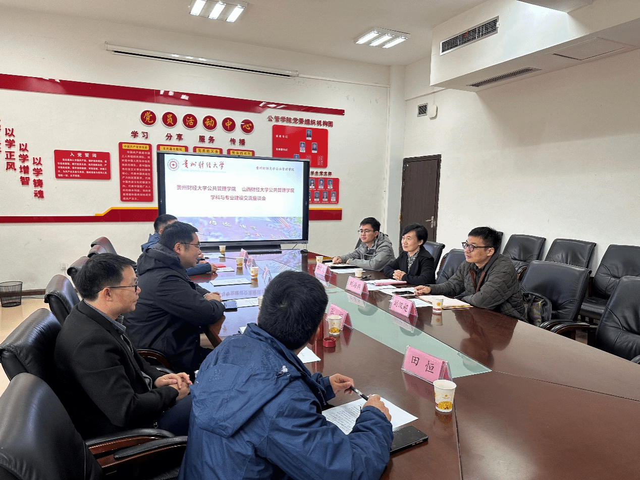 的到访表示欢迎,他介绍了学院从筚路蓝缕到获批公共管理一级学科博士点、行管和社保两个国家级一流本科专业建设点的发展历程。他特别强调人才是学科和专业建设的核心,贵州财经大学近年来的人才引进政策与奖励机制对学院实现跨越式发展起到了至关重要的作用。曾院长还着重分享了一流本科专业申报、学术团队建设、学术夏令营等方面的经验做法。