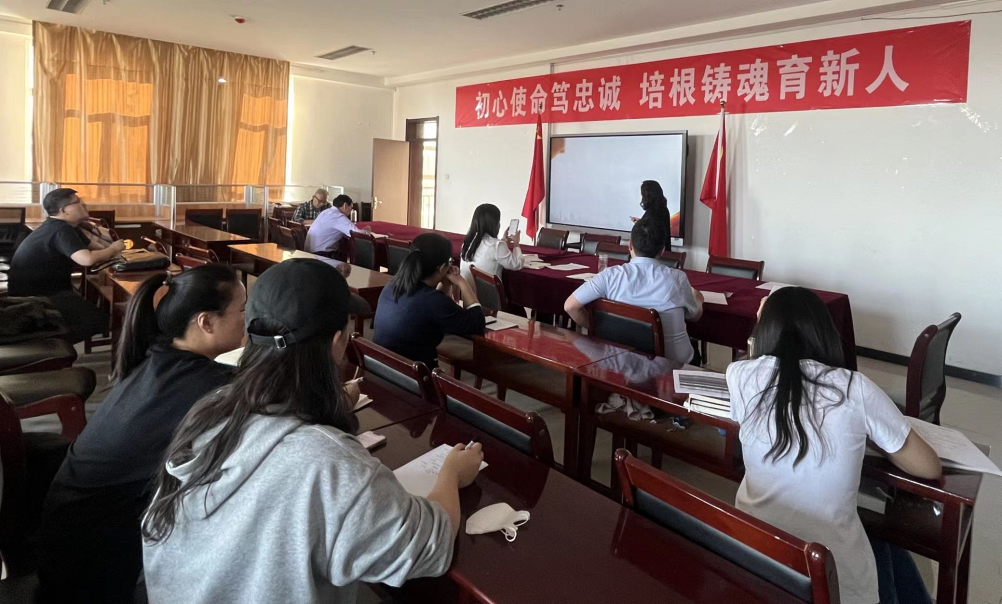 各党支部书记就近期支部工作作交流发言,行政管理研究生样板党支部书记宗婧表示:本次党课的学习内容很多很实,让我更加认识到党支部建立的伟大意义和重要作用,作为支部书记,我将牢记党员身份,明确支部书记职责,学好过硬本领,熟悉党务知识,用党员标准严格要求自己,在学生群体中起到带头表率作用。
