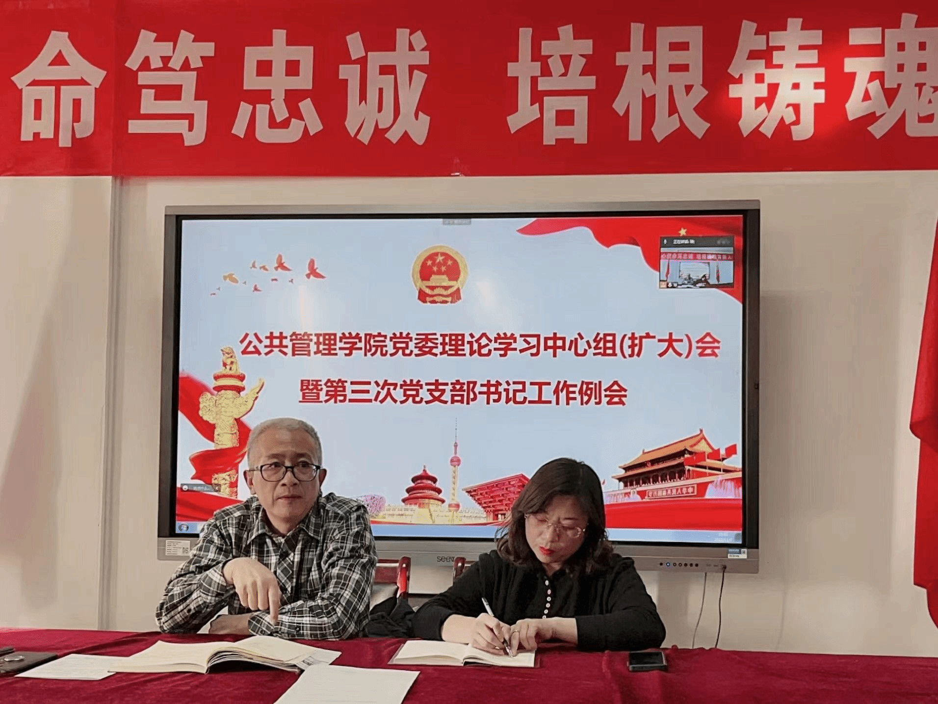 会议室气氛热烈。学院党委采取线上线下相结合的方式,组织召开中心组理论学习(扩大)会议暨第三次党支部书记工作例会,学习贯彻党的二十大精神,安排部署学院党委换届工作。会议由党委书记郜军主持领学,学院班子成员、专职组织员,党支部支部书记、支部委员,教研室主任,团学干部和学生党员代表参加学习。