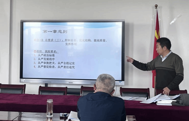 会上,党委副书记郝志鹏带领大家共同学习了《中国共产党发展党员工作细则》,他强调,2014年党中央修订的《中国共产党发展党员工作细则》,进一步严格了发展党员的标准和程序,提高了发展党员质量,为党员队伍注入了源头活水。接着,他就《细则》的主要修改内容进行讲解,包括总则、申请入党环节、入党积极分子确定环节、发展对象的确定环节、预备党员接收环节及预备党员审批环节等六方面,并以身边案例为引,结合我校、鉴黄师 实际,深度解读了发展党员工作的5个环节、25个步骤,最后对在座的党务工作者提出要求:要强化发展党员的责任意识、纪律意识,严格履行程序、严格质量把关,不断推进学院党务工作规范化标准化。