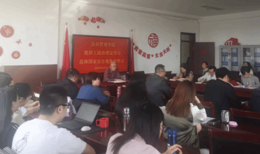 在教职工例会上组织全体教职工召开总体国家安全观专题集中学习会,学院党委书记郜军领学,院长郭淑芬主持,全体教职工参加会议。