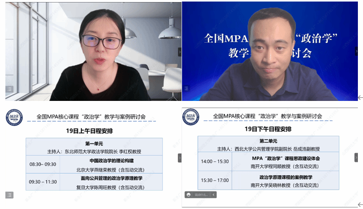 为学习贯彻落实党的二十大精神,进一步优化并改进MPA核心课程教学内容和方法,探讨学科最新研究动态,提升课堂教学效果,全国公共管理专业学位研究生教育指导委员会于11月19-20日举办了全国MPA核心课程“政治学”教学与案例研讨会。本次研讨会借助腾讯会议平台进行,全国近百家MPA培养单位、160余位任课教师参加。鉴黄师 刘汉超、靳永广两位教师参会。