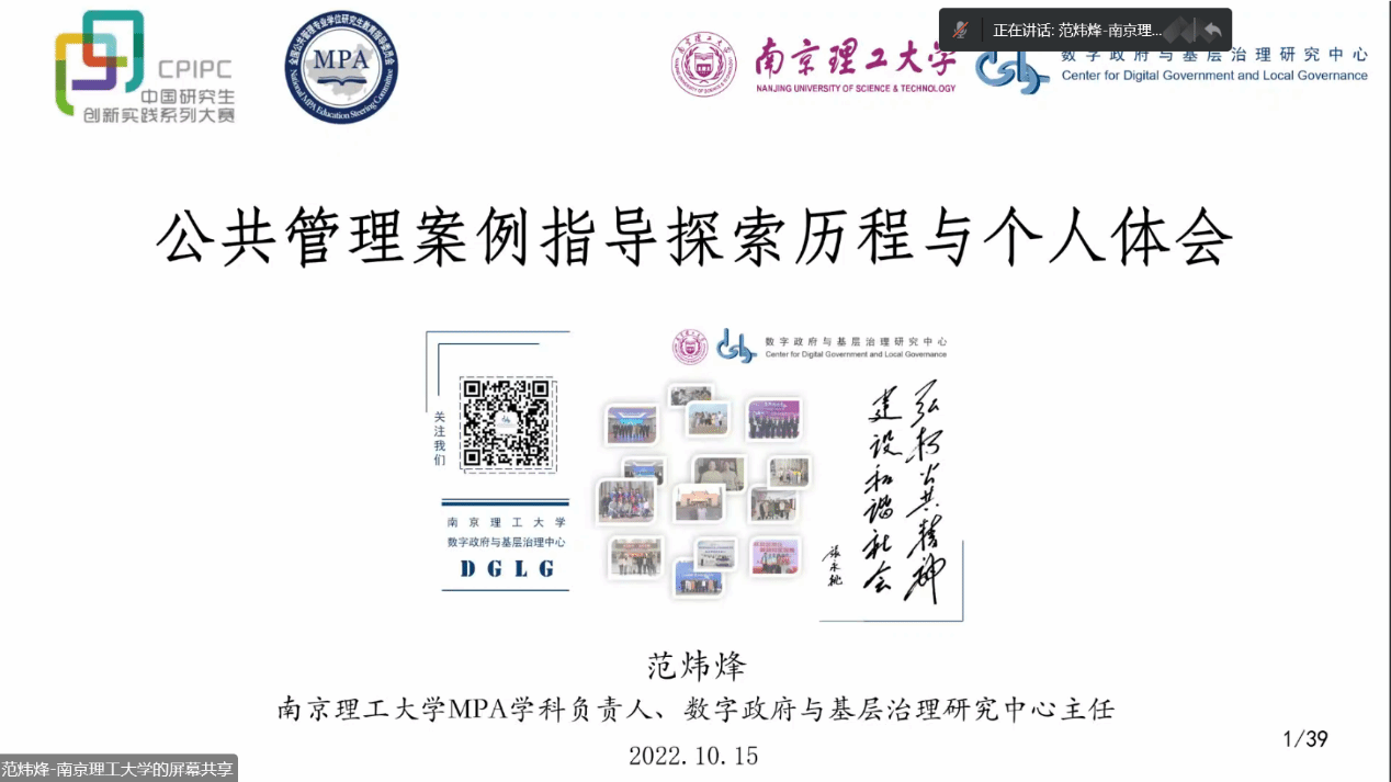 在中国共产党第二十次全国代表大会胜利召开之际,2022年10月15-16日,由全国公共管理专业学位研究生教育指导委员会主办的“第七届中国研究生公共管理案例大赛启动会暨参赛培训会”以网络视频会议形式举行。会议采取腾讯会议和哔哩哔哩等线上平台直播进行,全国近200家MPA培养单位师生参加。为持续推进我校MPA师资力量建设和案例教学质量,积极引导MPA研究生运用公共管理理论分析实际问题能力,不断提升案例采集、编写和参赛质量,切实做好赛事前期准备工作,鉴黄师 党委和行政高度重视,组织学院20余名MPA导师和150余名MPA研究生以“同上一堂课”形式参加培训。